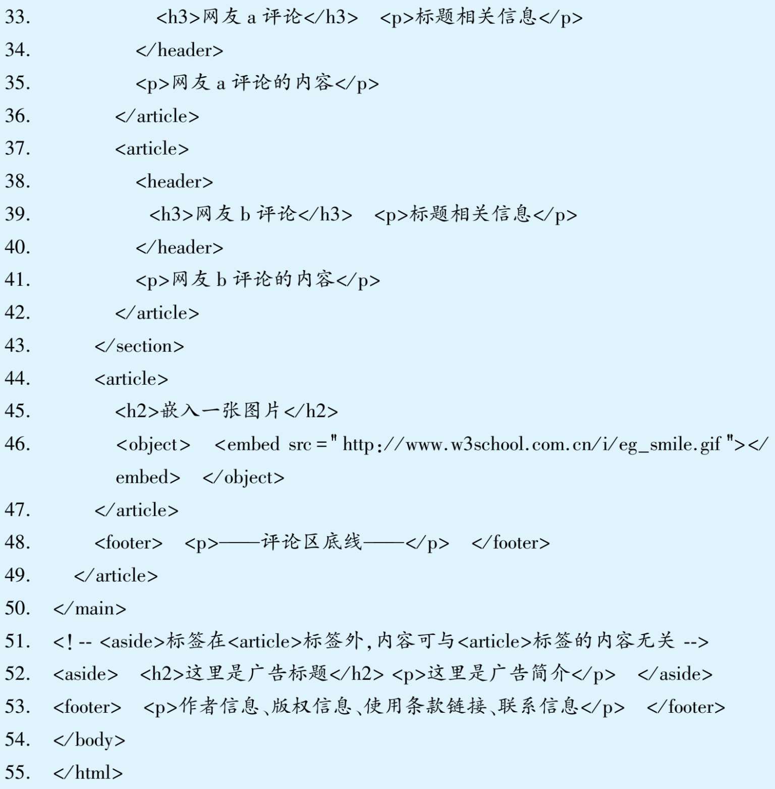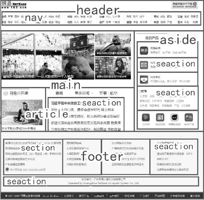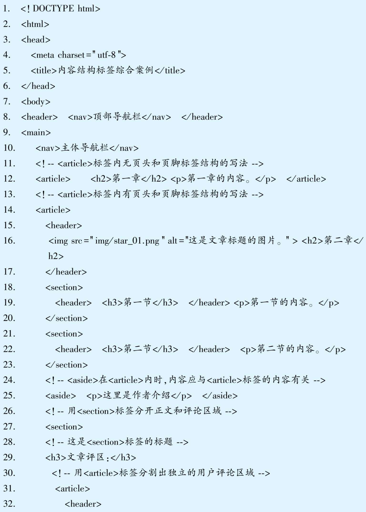 内容结构标签在网页代码中的运用如图2.7所示。从图中可以看到内容结构标签把网页划分为上中下三个区域。上部区域使用<header>标签划分,中区域使用<main>标签和<aside>标签划分,下部区域使用<footer>标签划分。每一个区域内又使用了相关的内容结构标签进行细分。