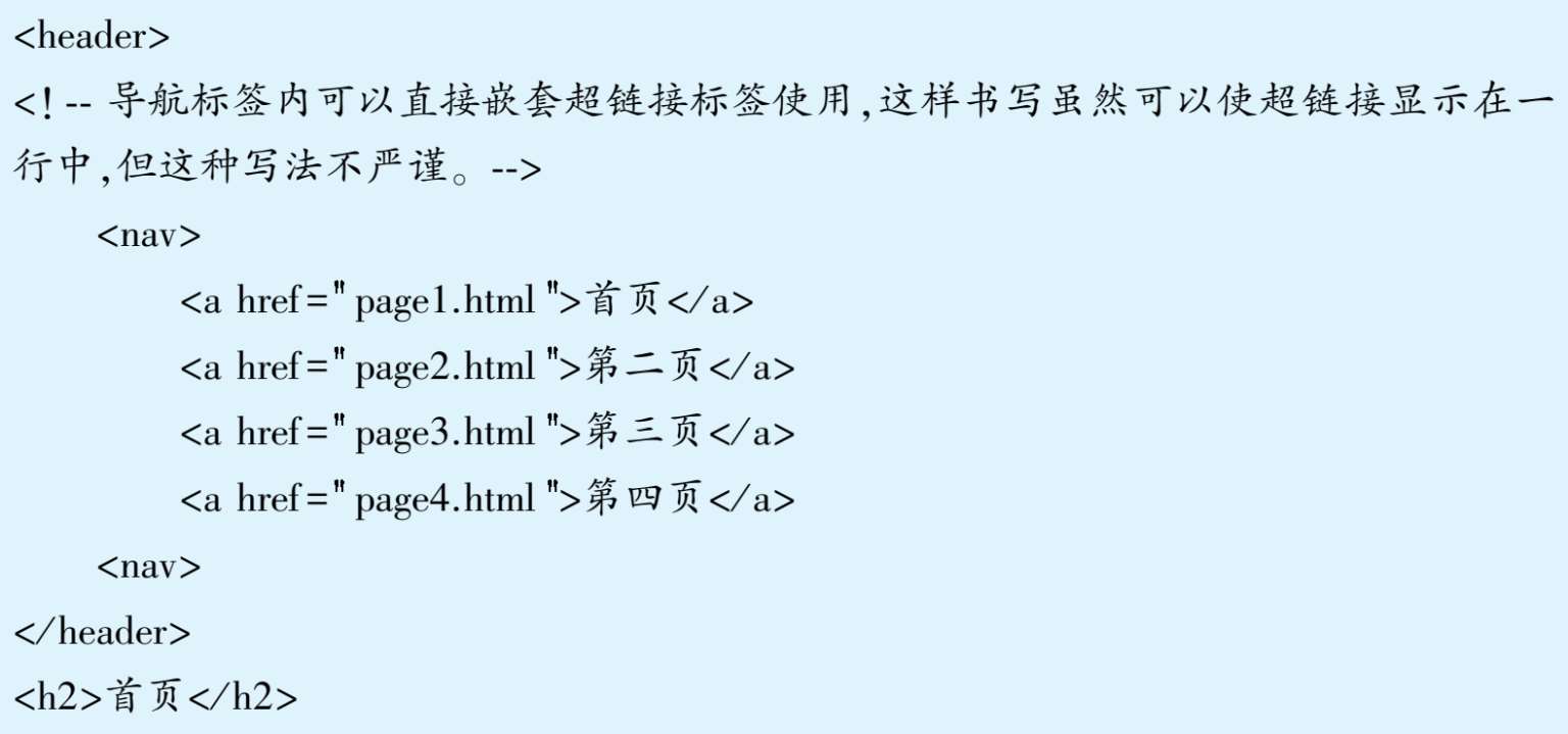 ②<nav>标签内通常嵌套<ul>列表标签和<a>超链接标签制作导航栏。