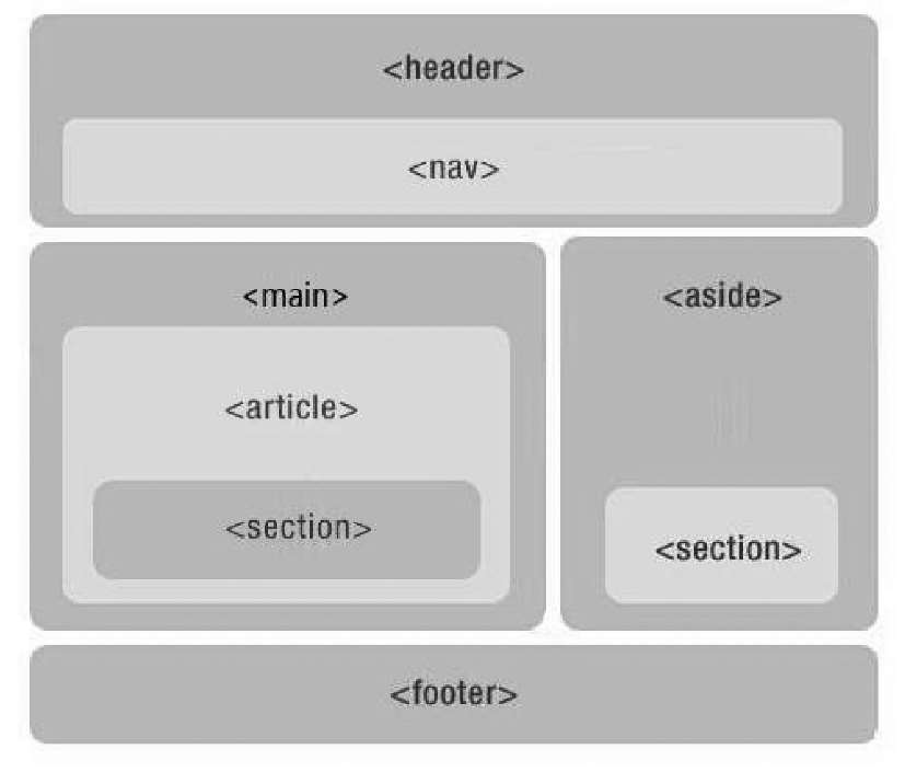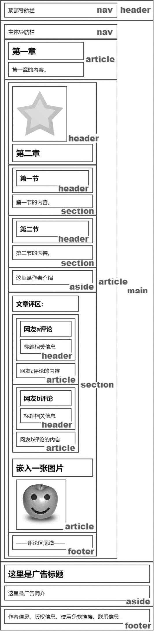 内容结构标签是只能在<body>内使用的标签,用来规范文本格式和布局网页结构。它虽然不会在浏览器的页面中显示出来,但是可以使浏览器和搜索引擎理解文档的结构和布局,也可以使文档看起来层次清晰,便于编辑和修改。这些结构标签有:<header>(页眉标签)、<nav>(导航标签)、<main>(主要内容标签)、<article>(独立内容标签)、<section>(区块内容标签)、<aside>(周边内容标签)、<footer>(页脚标签)、<hgroup>(标题分组标签)、<figcaption>(分组标题标签)、<div>(块标签)和<span>(行标签)。html文档中内容结构标签标准的使用方法如图2.6所示。