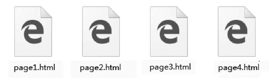 把使用案例的文档保存为page1.html,并且将<title>标签的内容书写为“首页”,之后再复制三个page1.html文件的副本在同一个文件层级中,并且依次重命名为page2.html、page3.html和page4.html如图2.10所示。