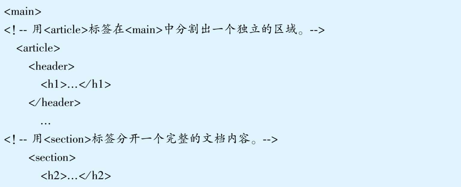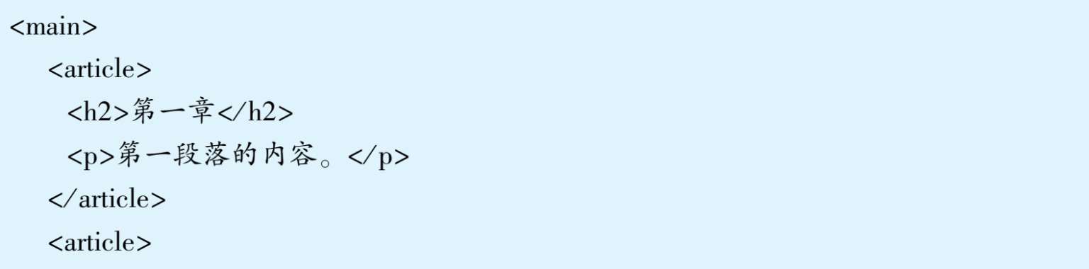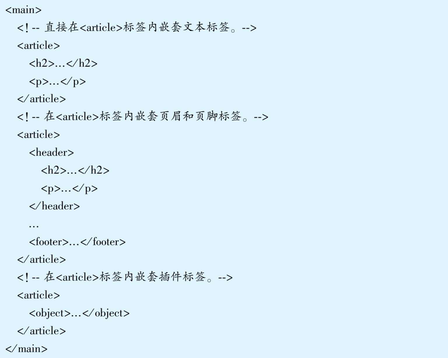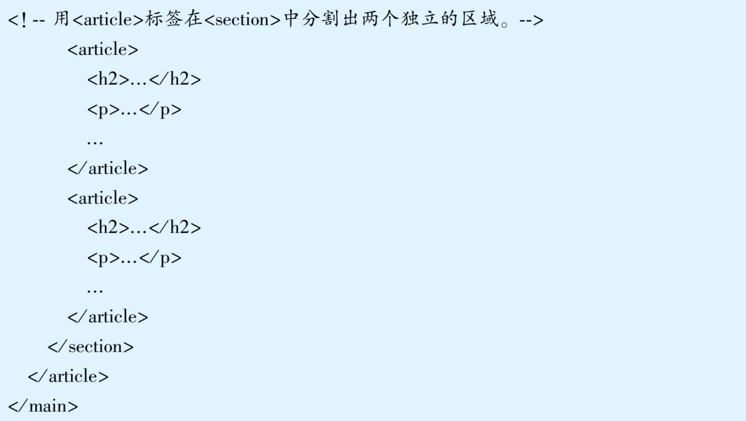 ②<article>标签内通常嵌套<section>区块内容标签或者文档内容标签,但是不能嵌套<main>标签。