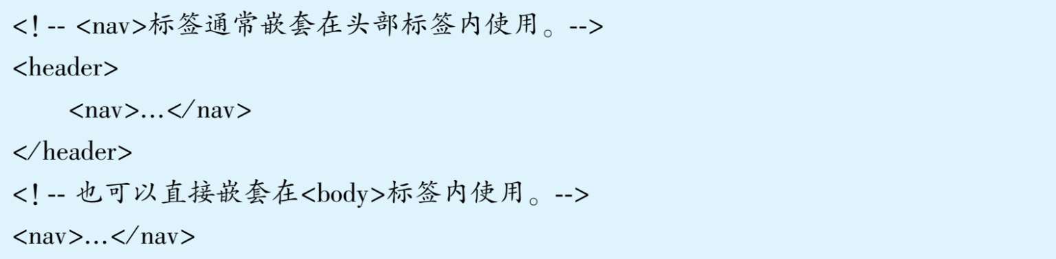 ①<nav>标签嵌套在<body>标签内或者其他内容结构标签内使用。