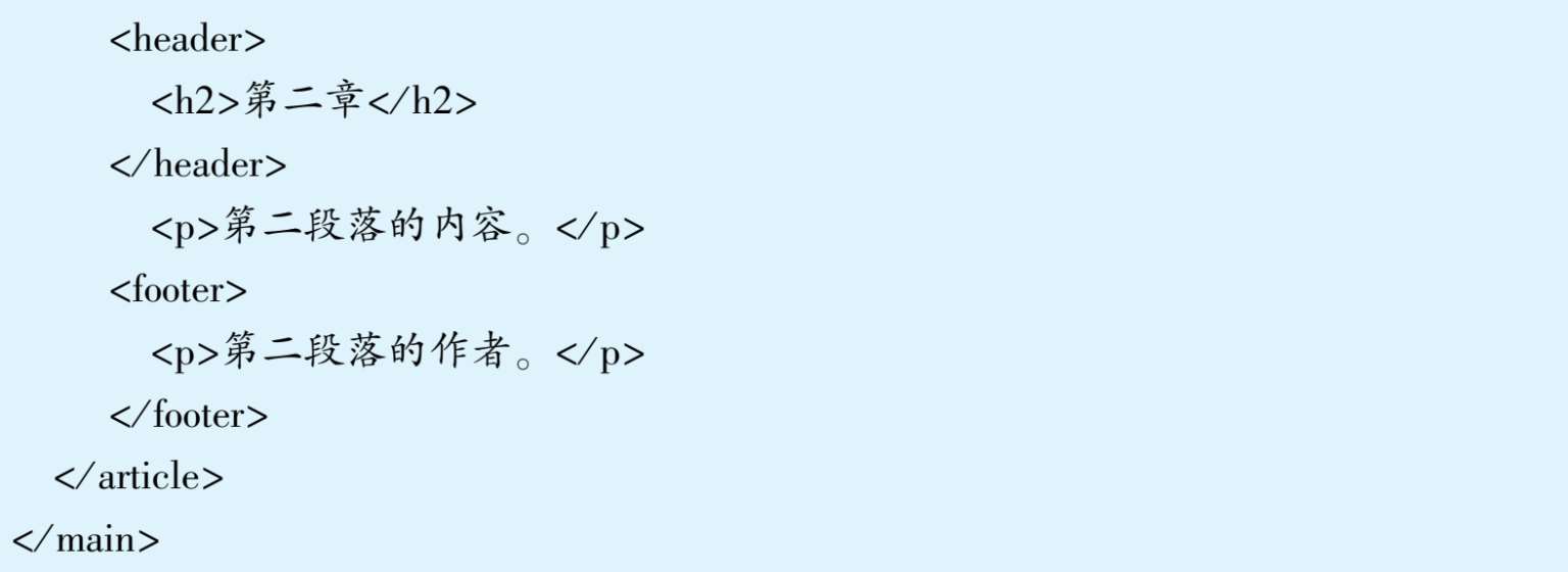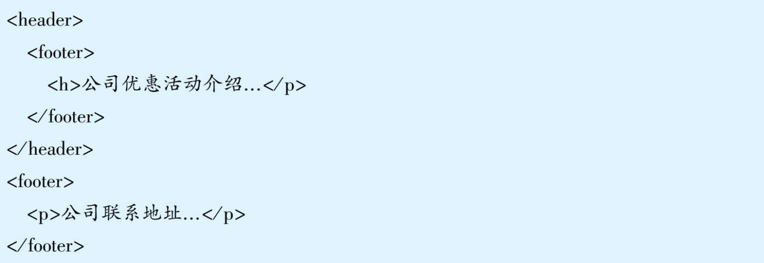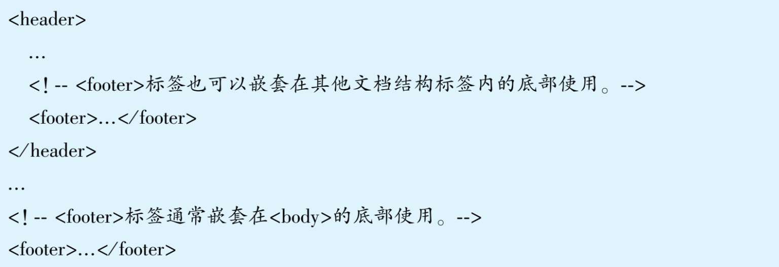 ②<footer>标签内通常嵌套内容结构标签或者文档内容标签,但是不能嵌套<main>标签。