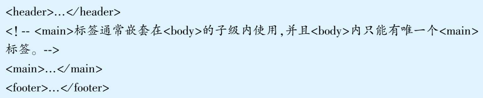 ②<main>标签内通常嵌套内容结构标签或者文档内容标签,它不能嵌套自身使用。