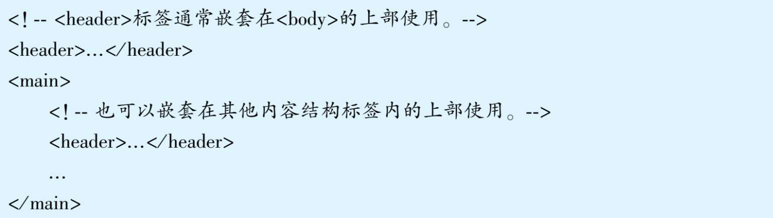 ②<header>标签内通常嵌套内容结构标签或者文档内容标签,但是不能嵌套<main>标签。