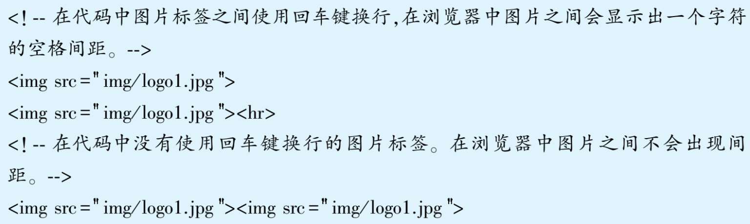 ①一个<img>标签可以插入一张图片,当连续插入多个图片时,最好不要在代码中使用换行符。因为换行符代表占位符,它会使每个图片之间产生一个空格的间距,并且会在浏览器中显示出这个空格,从而改变图片在页面中的间隔。更不要使用CSS修改这个间距,会产生更多意想不到的显示问题。例如: