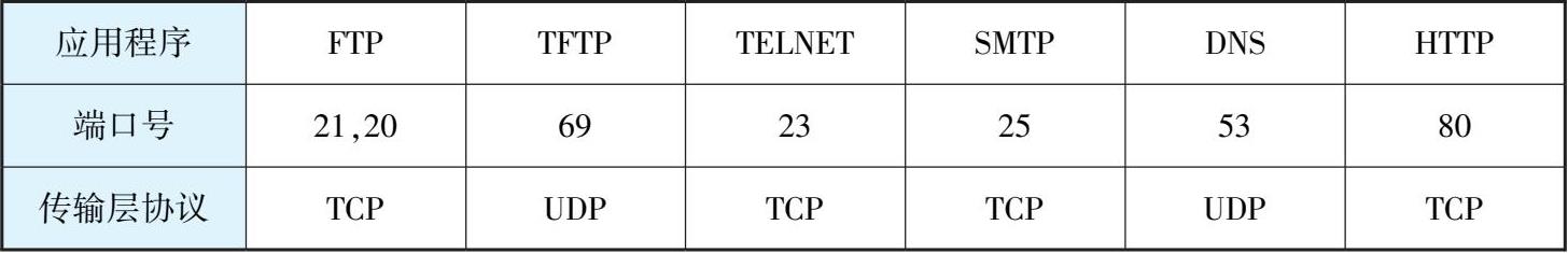 传输层为应用层提供应用程序之间端到端的通信,它通过给每个应用程序标识一个端口号来实现,并且它还负责数据传输的可靠性。网络中每个应用程序在同一时间内只能占用一个端口,每一个端口号也都有它确切的意义。端口号的范围为0~65535,其中,0~1023为系统占用的端口。常用的应用程序与对应的端口号和传输协议,如图1.8所示。