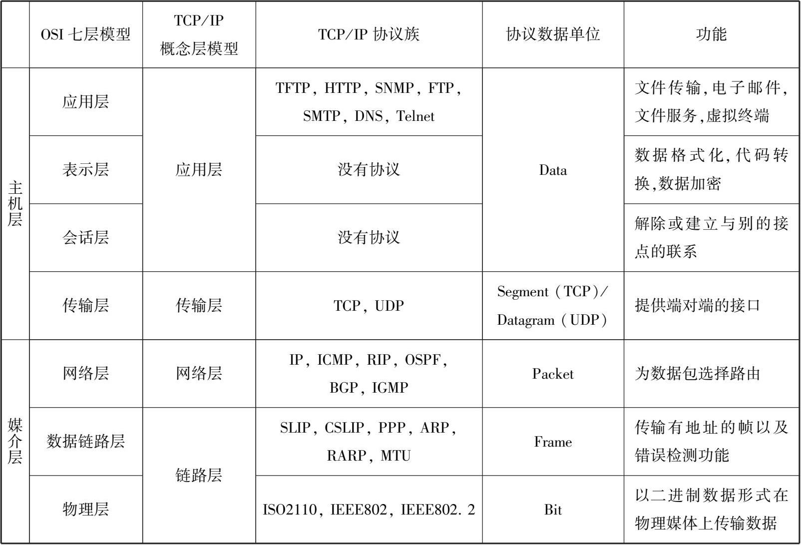 不同层中的协议各不相同,各层中的协议也多种多样,这些各式各样的协议都是为了解决不同数据之间能互相传输而产生的。要想让数据能顺利地在同层之间、层与层之间互相传递,就必须在同层之间使用相同的协议、在层与层之间选择合适的协议,否则每层之间的接收方和发送方将无法进行通信。互联网使用的网络协议是TCP/IP(Transmission Control Protocol/Internet Protocol),中文称为传输控制协议/网际协议,它是OSI七层模型的一种变化模型。作为互联网的基础协议,任何和互联网有关的操作都离不开TCP/IP协议,没有它就无法上网。