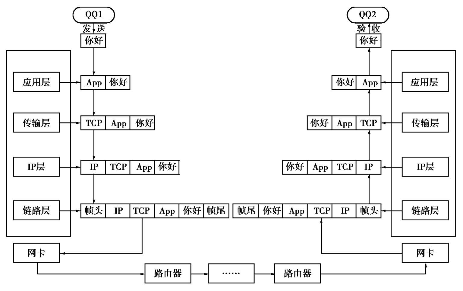 简而言之,IP协议负责数据的传输,而TCP协议负责数据的可靠传输。图1.10以QQ软件传输文本信息为例,说明数据是如何使用TCP/IP协议传输的。