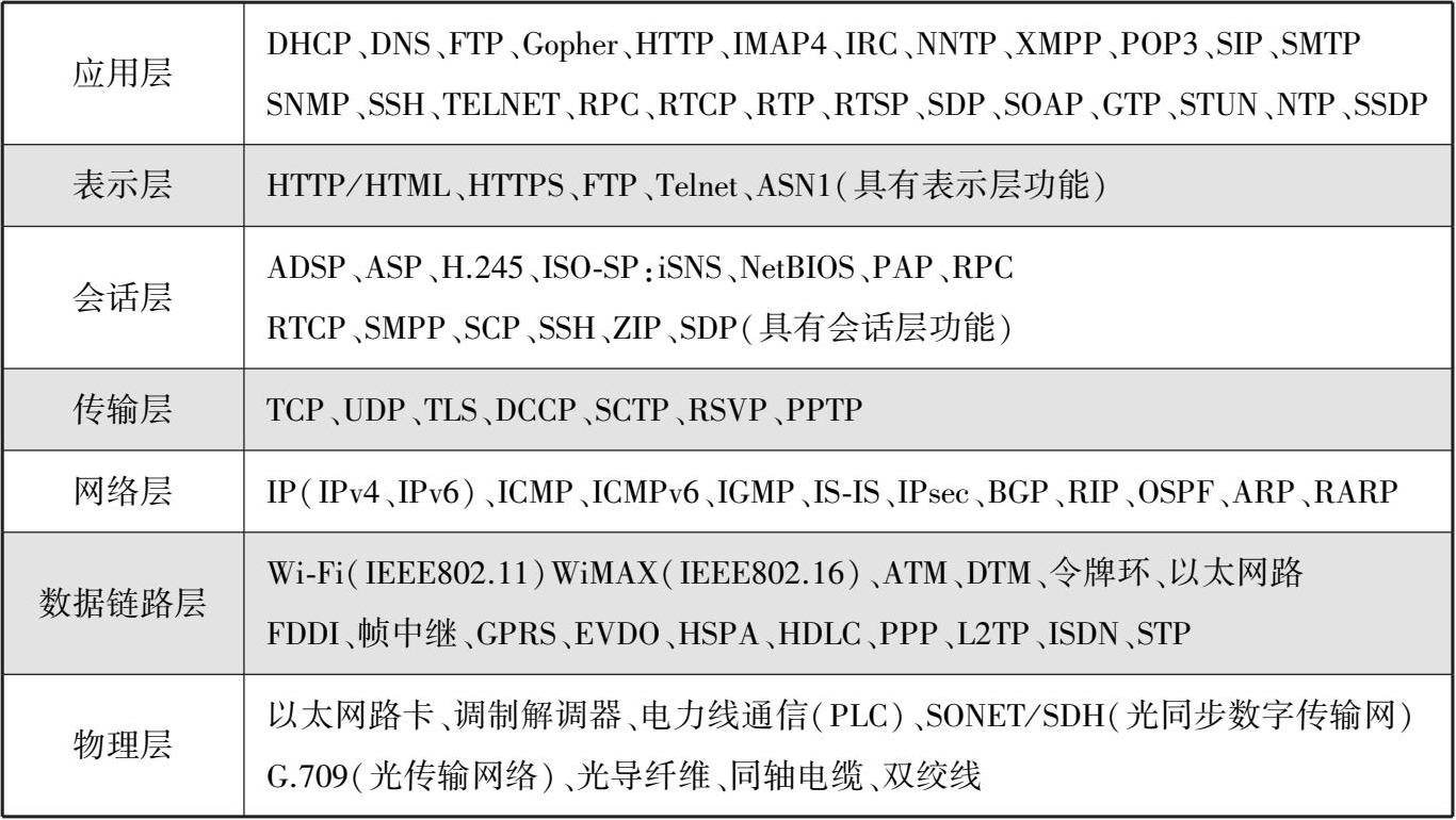 网络协议就是信息在网络设备之间传输和交换的规则和标准。由于网络节点之间联系复杂,不同的设备之间通信的协议也不相同。为了使设备能在网络之间互相通信,国际标准化组织(International Standard Organization,缩写为ISO)制定了计算机网络体系结构通信协议,并且命名该协议为开放系统互连参考模型(OSI/RM)。这个协议可划分为七层,每一层都是建立在它下层的基础之上,并且为它的上一层提供特定的服务。从下到上依次划分为:物理层( Physics Layer)、数据链路层(Data Link Layer)、网络层( Network Layer)、传输层(Transport Layer)、会话层( Session Layer)、表示层( Presentation Layer)、应用层(Application Layer),如图1.1所示。