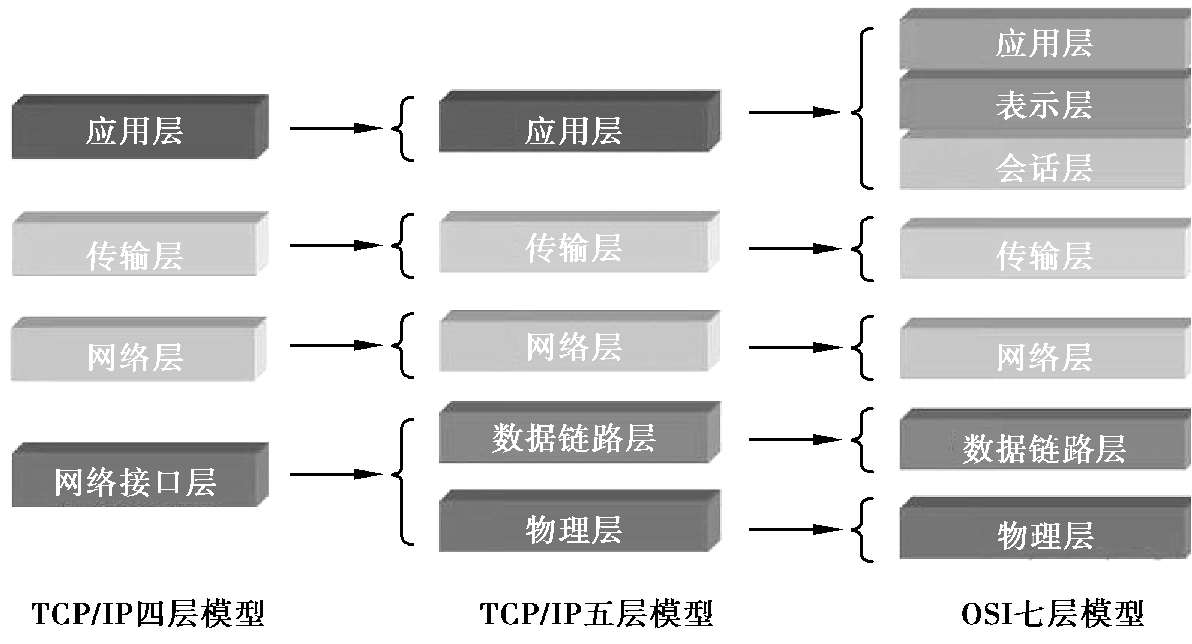 从图1.2可以看出,互联网协议将OSI七层模型变成了TCP/IP四层或者五层模型。当把物理层和数据链路层合并成一层时,再把会话层、应用层和表示层合并成一层时,就成为四层模型;当只把应用层、表示层和会话层合并成一层时,就成为五层模型,如图1.2所示: