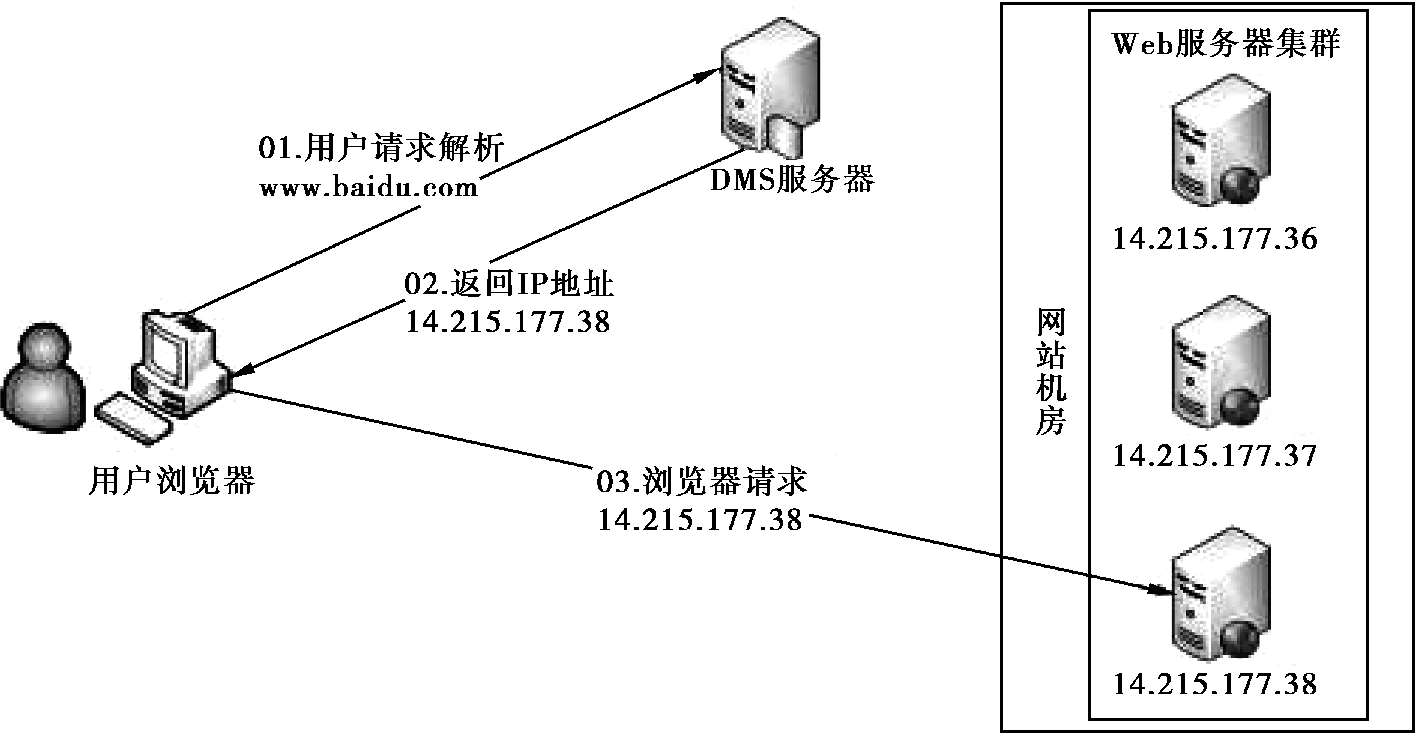 有了域名后,还不能直接使用。因为计算机并不理解域名的含义,还需要将域名和IP地址绑定在一起才能使用。当我们使用域名时,域名服务器会将域名转换成绑定的IP地址。这种将域名转换成IP地址的过程叫做域名解析。例如,www.baidu.com的域名和IP地址14.215.177.38是相互对应的。当我们在浏览器中输入域名www.baidu.com时,按回车键后,域名会发送到域名服务器上解析成IP地址,之后再返回计算机上,再去连接对应的网站,如图1.14所示。