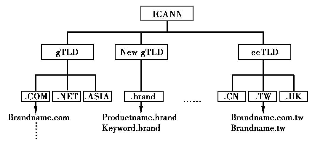 第三类是新通用顶级域名(New Generic Top-level Domain,简称New gTLD),一般由企业和个人使用,目的是解决通用顶级域名不够用的问题,同时也能增强企业品牌的竞争力、塑造企业品牌的价值,建立企业专属的网络身份,提高企业网络的安全。截至2012年,新顶级域名的数量为1409个。例如:huawei表示品牌域名、weibo表示业务域名、top表示“高端”域名、red表示“红色”域名等。