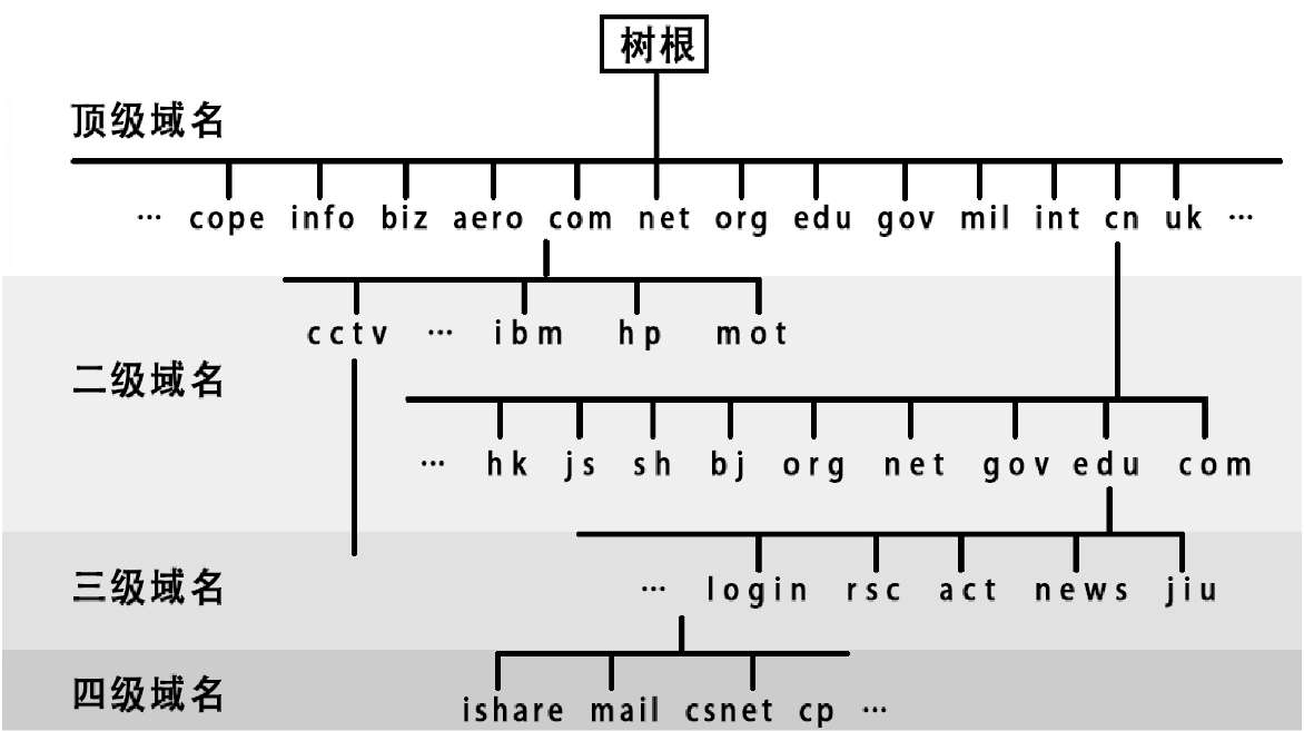 域名由两组或两组以上的ASCII或者各国语言字符构成,各组字符间使用英文点号“.”分隔。级别从右向左依次降低,最右边的字符组称为顶级域名或者一级域名,倒数第二组的字符组称为二级域名,倒数第三组的字符组称为三级域名,以此类推。例如:rsc.cqucc.com,rsc为三级域名,cqucc为二级域名,com为一级域名。
