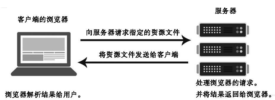 浏览器(Web Browser),全称为网页浏览器,是安装在客户端上的一种软件,比如安装在电脑、平板电脑和手机上,用来访问和浏览网络信息和资源。用户可以在浏览器的地址栏中输入统一资源标志符(URI也就是通俗说的网址)向服务器请求指定的资源文件,服务器在收到请求后会将网页文件发送到客户端的缓存文件夹中,然后浏览器通过渲染引擎解析和排版接收到的网页文件并将最终的内容显示在浏览器的窗口中。浏览器的工作原理如图1.17所示。