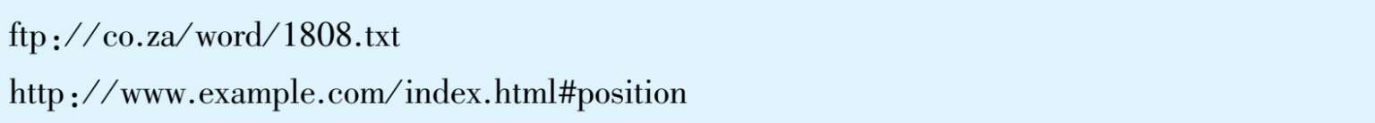 这两个网址既是URI又是URL,它们都是通过寻找某个命名空间中的资源标识找到资源。如果去掉资源的访问方式ftp://和http://,co.za/word/1808. txt和www. example.com/index.html#position就成了URN。