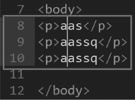 用鼠标单击要添加内容的位置,按下Shift键和鼠标右键,并且竖向拖动鼠标,经过之处可以插入多行光标,之后进行多行输入。例如:用鼠标单击第8行的标签内容后,按Shift键和单击鼠标右键,并且向下拖动光标到第10行,就可以在第8行到第10行之间输入相同的内容了。同时编辑多行中竖列的内容,如图1.29所示。
