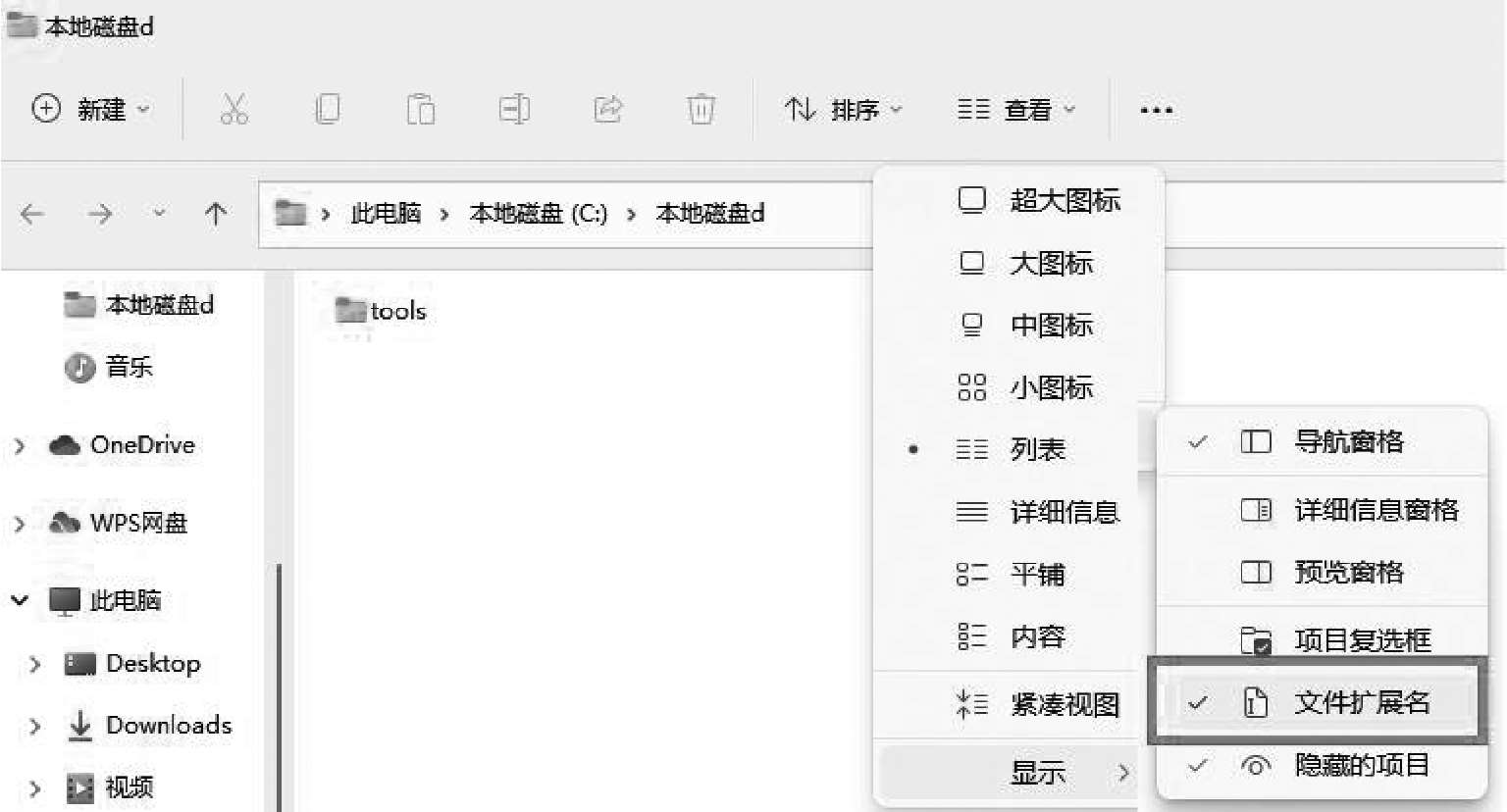 作为一个程序员,掌握文件的全部名称是很重要的,它有助于识别文件的类型。如果桌面上只显示出了文件名而没有后缀名,说明系统没有打开文件名后缀的显示。这里以Win11系统为例,说明如何显示文件的扩展名。首先,在桌面上找到“计算机”图标,双击打开文件夹窗口。其次,在打开的文件夹窗口的菜单栏中找到“查看”。之后,在查看菜单中找到“显示”选项中的“文件扩展名”选项,点击此选项即可。设置文件扩展名显示,如图1.34所示。
