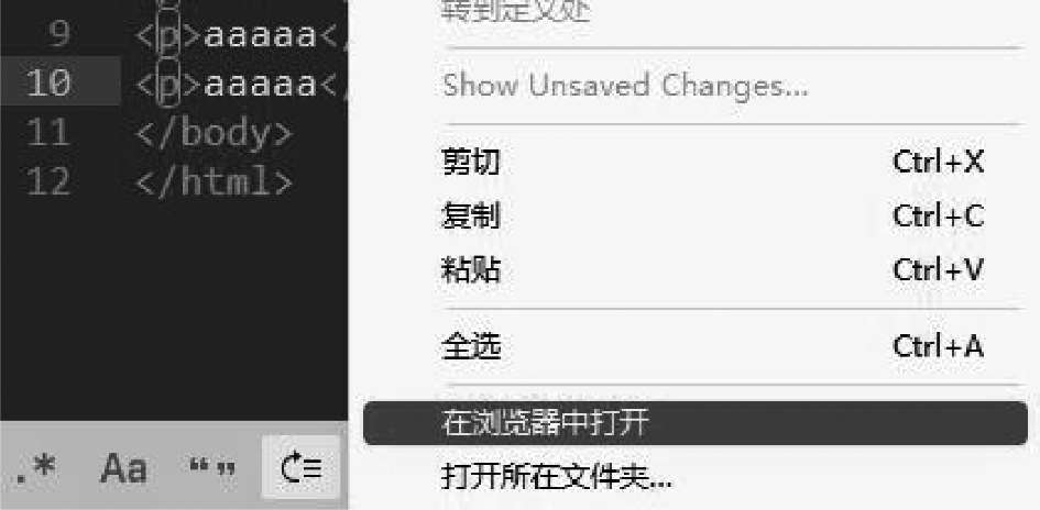 Sublime Text只提供编辑代码的环境,但是不提供运行代码的环境。要查看代码的效果需要将代码在浏览器中打开。可以双击文件打开,也可以将文件拖动到浏览器中打开,还可以在Sublime Text的编辑窗口中右键弹出的菜单栏中选择“在浏览器中打开”选项打开文件。注意:一个文件可以同时在多个浏览器中打开,修改原文件后先要保存,再在浏览器中查看文件,查看时要刷新浏览器中的内容,否则不会显示当前编辑文件的效果。在Sublime Text中打开文件,如图1.33所示。