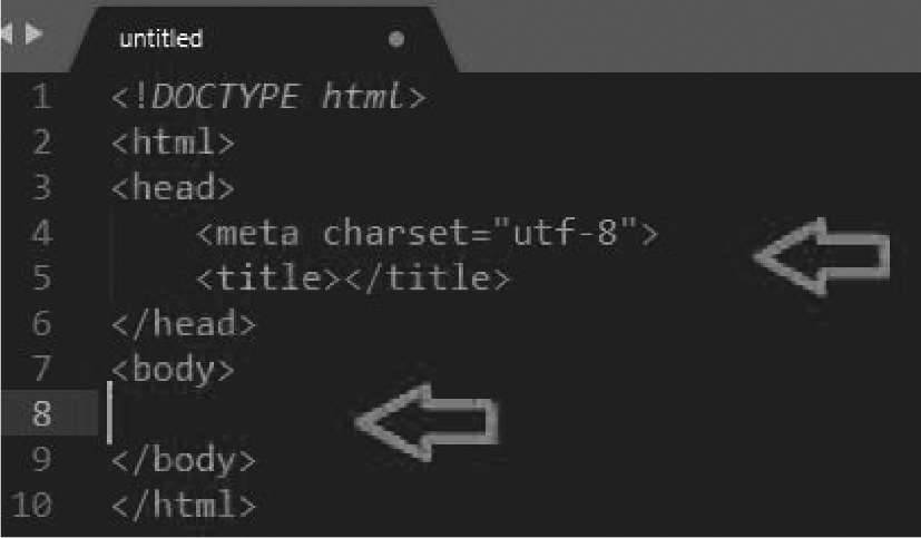 在窗口中的第一行输入小写英文html后,按tab键,软件会自动生成html的标准结构代码。从图1.25可以看出,软件每一行显示一条html代码,代码前都标有序列号,以方便定位和查找代码的位置。编写代码的地方主要是在<head>标签内和<body>标签内,如图1.25中箭头处所示。