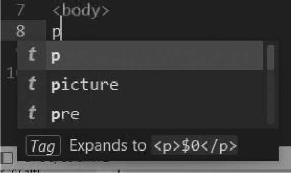 在文档内输入标签名后,按Tab键,软件会弹出相同字母开头的标签,供开发人员选择使用。使用上下键选择需要的标签名后按回车键确定、按Tab键确定或者鼠标点选确定都可以。例如:在<body>标签内输入字母p后,按Tab键会出现选择列表,p标签就在第一个,所以再按Tab键会就可以自动生成一行段落文字标签。快速添加标签,如图1.26所示。