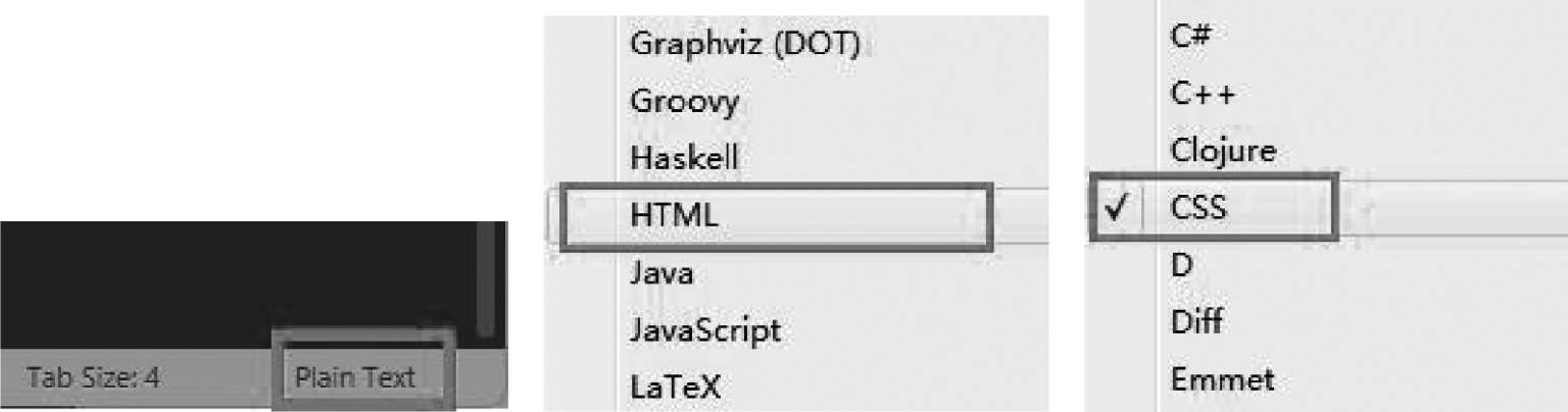 在写代码前,首先要设置编写代码的类型。如果不设置代码的类型,软件将不会提供代码的快捷输入方式。设置方法为:点击窗口的右下角的plain text,系统会弹出各种编程语言,这里选择HTML即可。同样的,在编写外部CSS样式时,选择CSS即可。如图1.24所示。