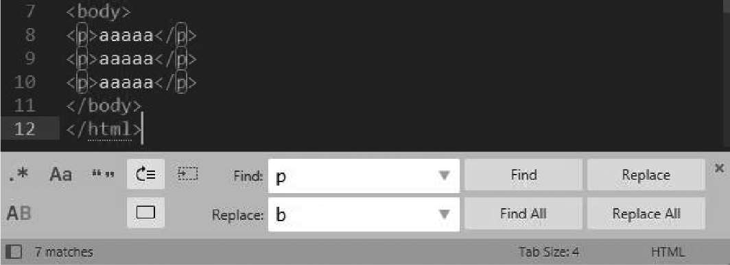 按Ctrl+H快捷键后,在软件的窗口下方会弹出查找替换窗口,在查找栏输入要查找的内容,在替换栏输入要替换的内容,点击替换按钮即可替换内容。例如:在查找栏输入p,在替换栏输入b,点击全部替换按钮后会替换全部的内容。查找替换文档中的内容,如图1.30所示。