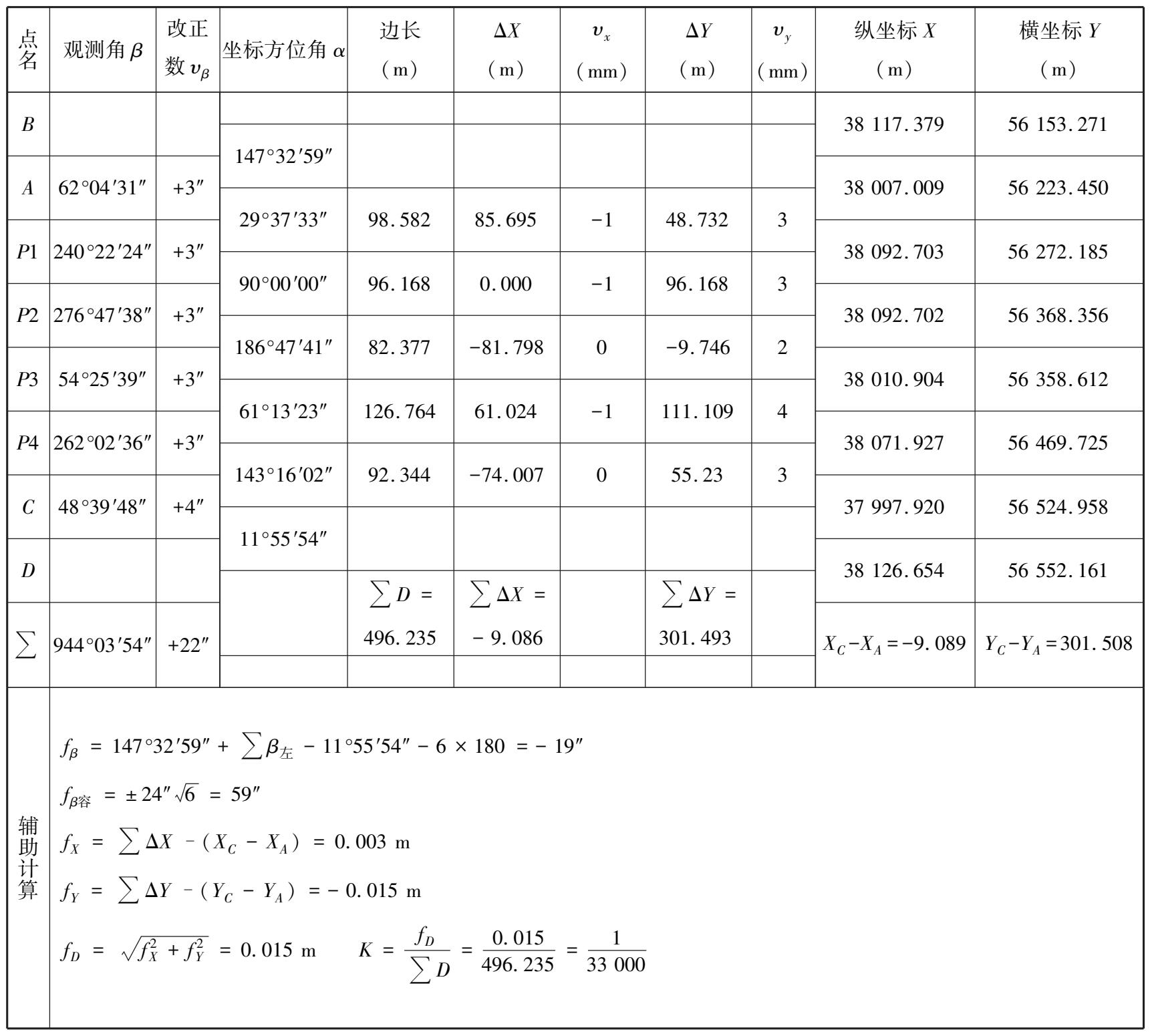 其余计算均和导线一样,附合导线坐标计算示例如表 2.17 所示。