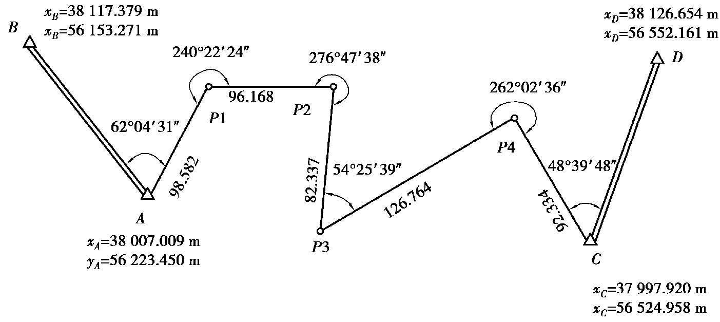 根据校核过的外业观测数据及起算数据绘制草图,草图要基本符合比例,如图 2.23 所示。将数据填入“附合导线坐标计算表”中,起算数据用单线标明。
