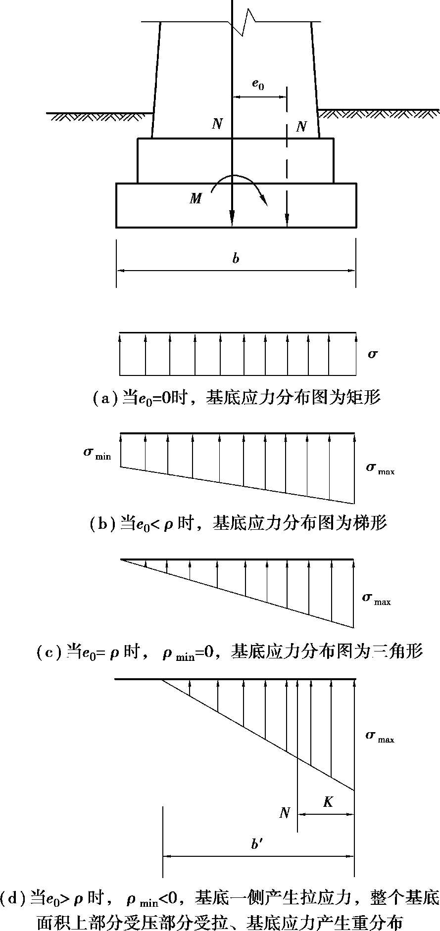 墩台基础设计计算时,必须控制基底合力偏心距,其目的是尽可能使基底应力分布比较均匀,以免基底两侧应力相差过大,使基础产生较大的不均匀沉降,导致墩台发生倾斜,影响正常使用。设计时,使其合力尽量接近基底形心,控制其偏心距 e 0 ,使其不超过某一合力偏心距允许值。