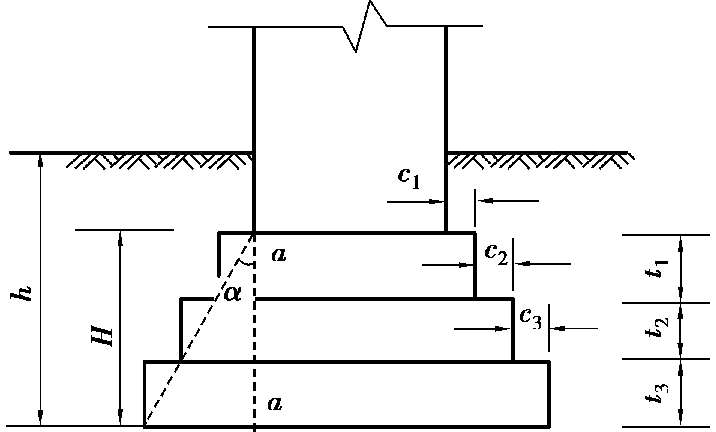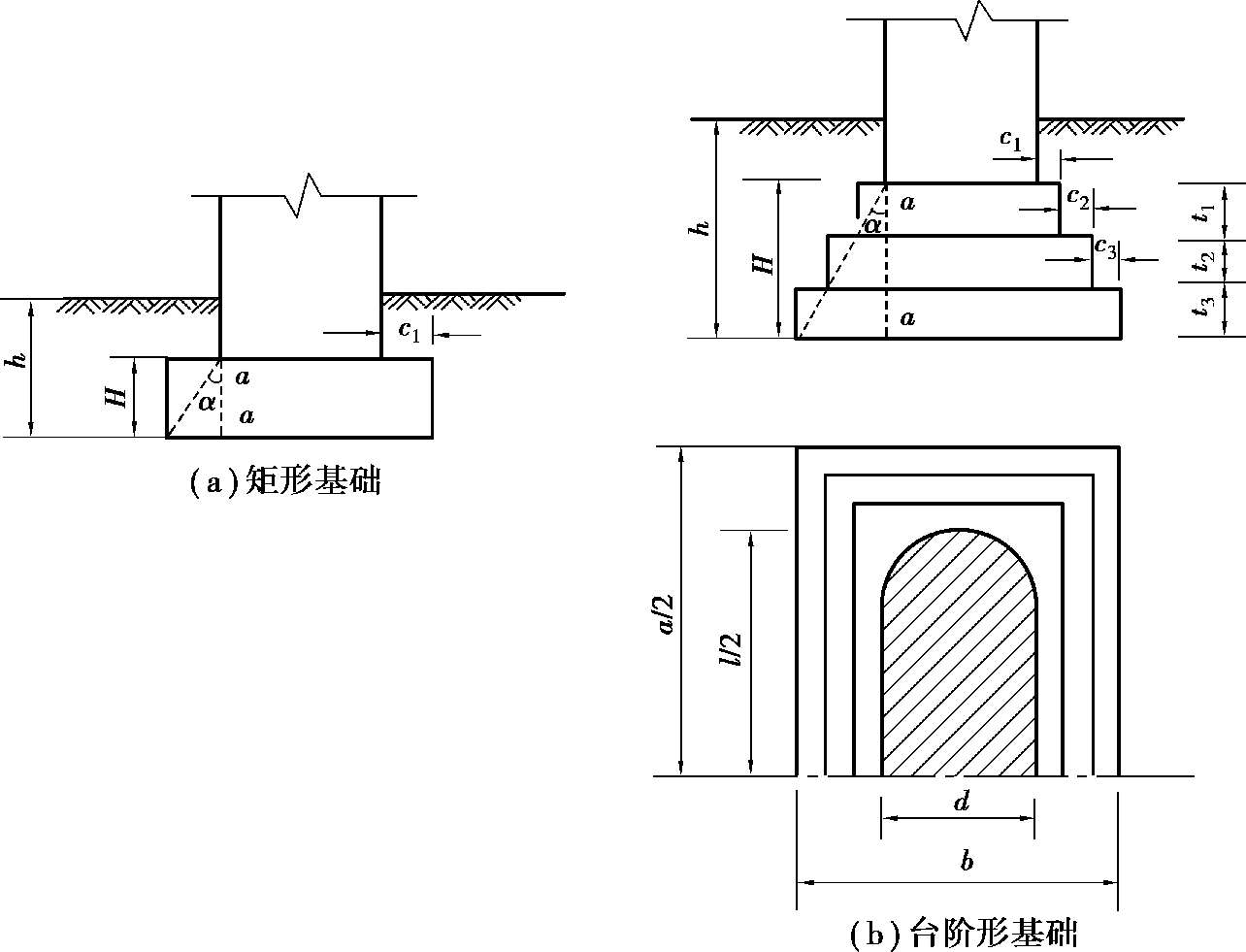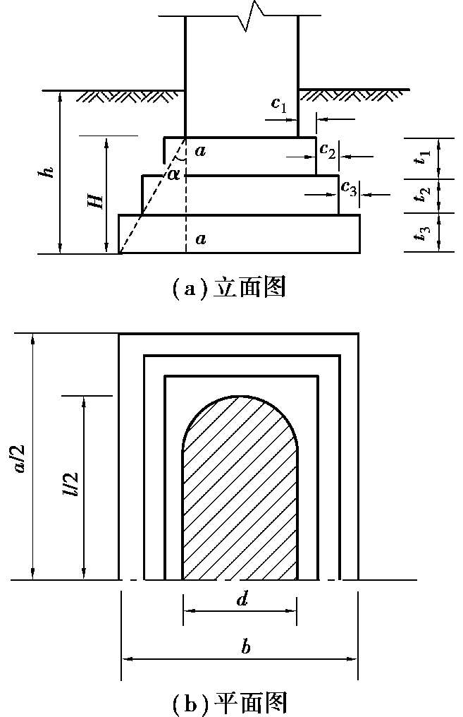 所以,在拟定尺寸时,应使 α ≤ α max ,同时使每个台阶宽度与厚度 t i 保持在一定比例内,使其扩散角 α i ≤ α max ,这时认为基础本身强度能够得到保证,不必对基础进行弯曲拉应力和剪应力的强度验算,在基础中可不设置受力钢筋。