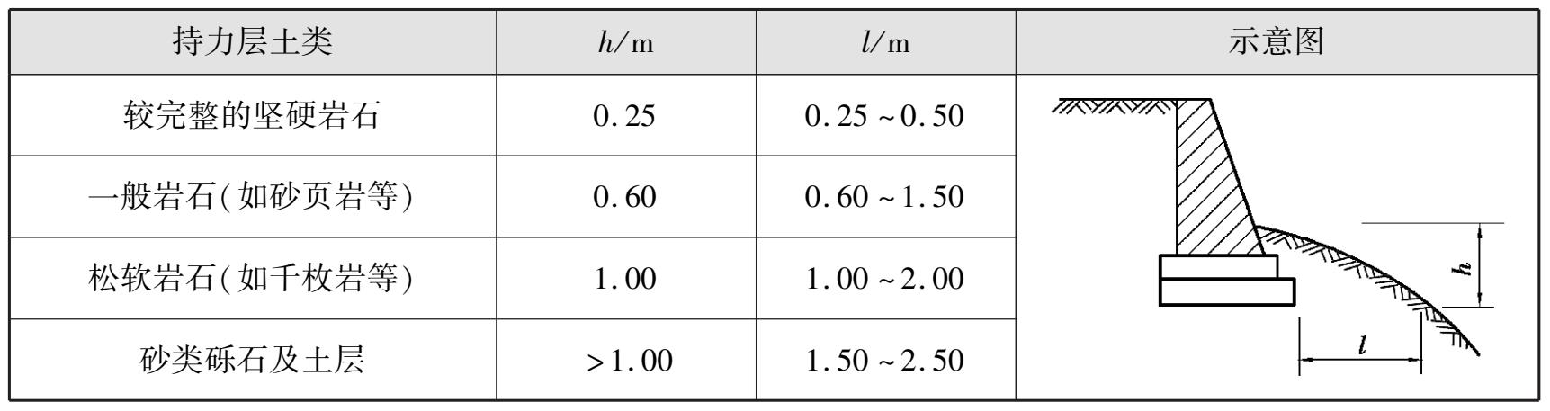 若基础位于较陡的岩体上,可将基础做成台阶形,但要注意岩体的稳定性。斜坡上基础埋深与持力层土类关系见表 2.3。
