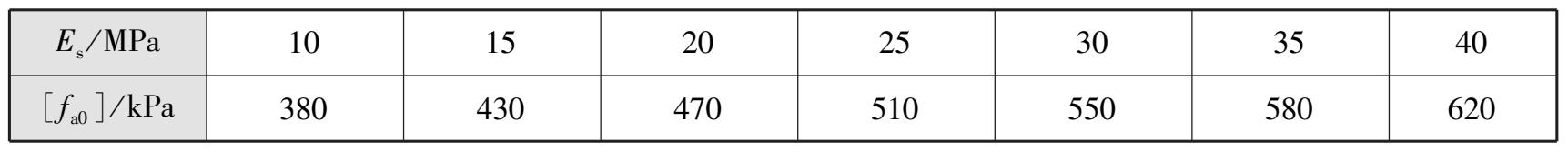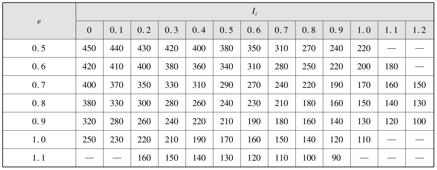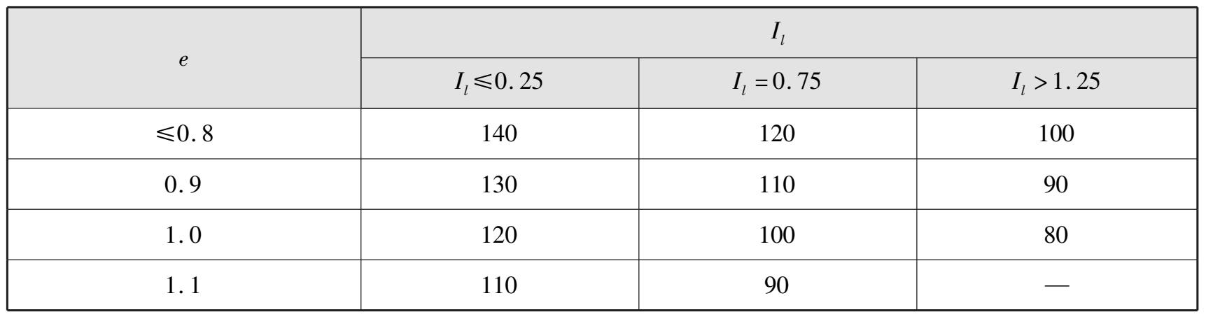 ②当 e < 0.5 时,取 e = 0.5;当 I l < 0 时,取 I l = 0。此外,超过表列范围的一般黏性土,[ f a 0 ]= 57.22 E 0s . 57 。
