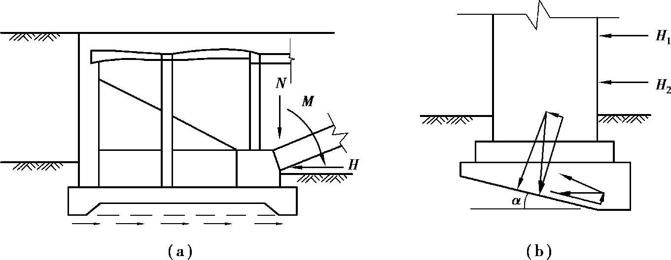 对于拱桥桥台,由于在拱脚水平推力作用下,基础的滑动稳定性不能满足要求时,可在基底四周做成如图 2.17(a)所示的齿槛。这样由基底与土间的摩擦滑动变为土的剪切破坏,从而提高基础的抗滑力。如仅受单向水平推力时,也可将基底设计成如图 2.17(b)所示的倾斜形,以减小滑动力,同时增加在斜面上的压力。由图 2.17(b)可见,滑动力随 α 角的增大而减小。从安全考虑, α 角不宜大于 10°,同时要保持基底以下土层在施工时不受扰动。