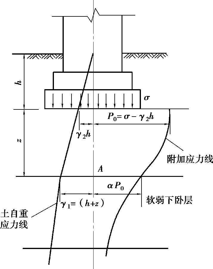 受压层范围内地基为多层土(主要指地基承载力有差异而言)组成,且持力层以下有软弱下卧层(指容许承载力小于持力层容许承载力的土层),还应验算软弱下卧层的承载力。验算时,先计算软弱下卧层顶面 A (在基底形心轴下)的总应力(包括自重应力及附加应力)不得大于该处地基土的容许承载力(图 2.13):