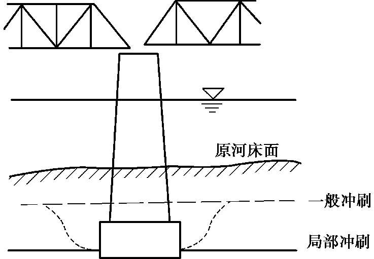在有水流的河床上修建基础时,要考虑洪水对基础下地基土的冲刷作用(图 2.5),洪水水流越急,流量越大,洪水的冲刷越大,整个河床面被洪水冲刷后要下降,称为一般冲刷,被冲下去的深度称为一般冲刷深度。同时桥墩的阻水作用使洪水在桥墩四周冲出一个深坑,称为局部冲刷。