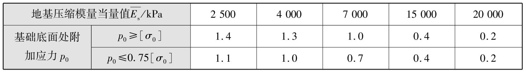 注:表中 p 0 = σ h - γh , σ h 为基底压应力,近似采用基底压应力图形中距最大应力点 b / 4 ~ b / 3 处的压应力。[ σ 0 ]为基础底面处地基的基本承载力。 E s 为沉降计算总深度 z n 内地基压缩模量的当量值,应按下式确定: