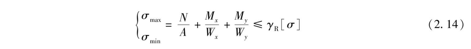 对于式(2.14)和式(2.15)中的 N 值及 M (或 M x 、 M y )值,应按能产生最大竖向力 N max 的最不利荷载组合与此相对应的 M 值,能产生最大力矩 M max 时的最不利荷载组合与此对应的 N 值,分别进行基底应力计算,取其大者控制设计。
