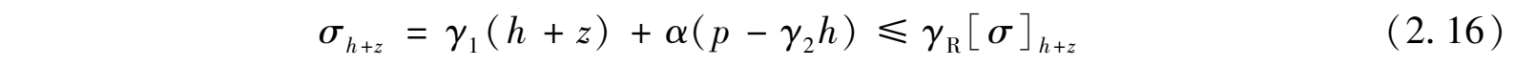 [ σ ] h + z ——软弱下卧层顶面处的容许承载力,kPa。《公路桥涵地基与基础设计规范》(JTG 3363—2019)规定按式(2.17)、式(2.18)、式(2.19)确定,式中 h 应采用 h + z 计算。