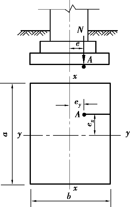 外力合力作用点不在基底两个对称轴中任一对称轴上或基底截面不对称时,可直接按下式求 e 0 与 ρ 的比值,使其满足规定的要求。