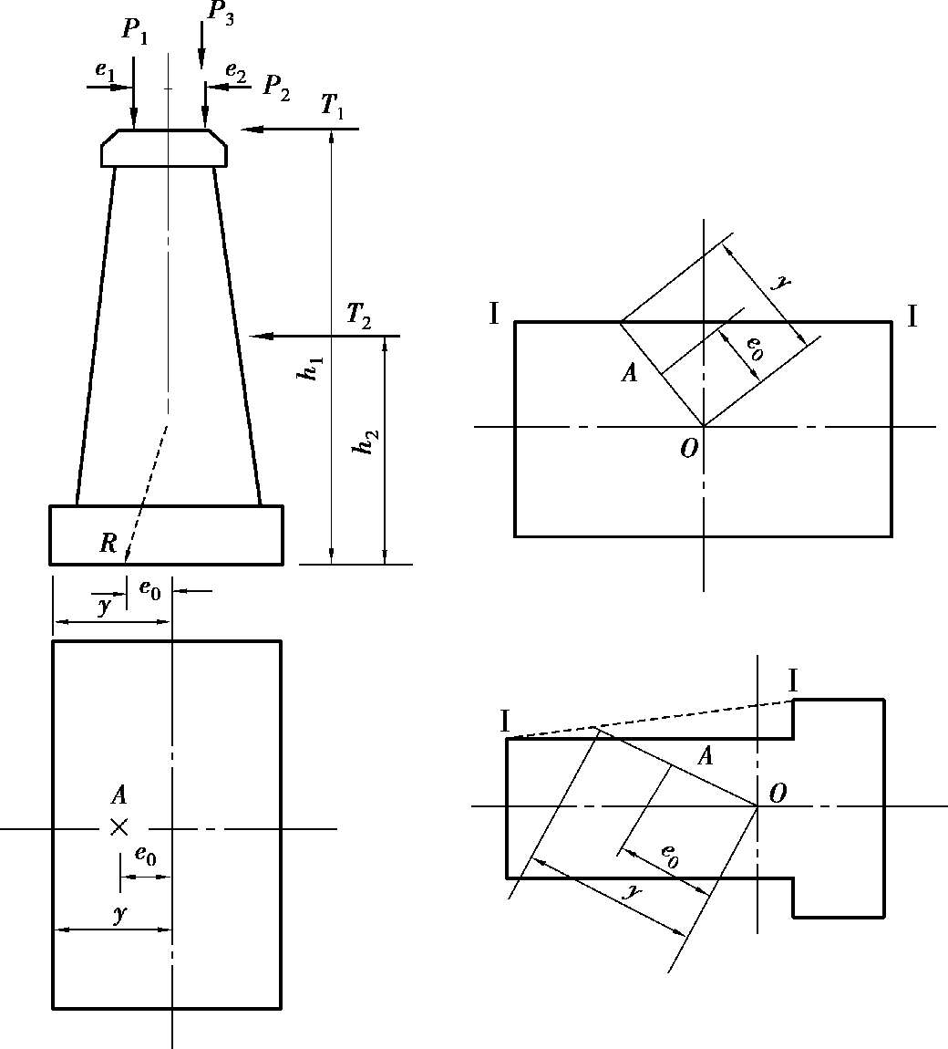 图 2.14 中, O 为截面重心, C 为合力作用点, R 为所有外力的合力,∑P i 为各竖向力的总和,∑T i 为各水平力的总和, P 1 、 P 2 、 P 3 为各竖向力, T 1 、 T 2 为各水平力, A — A 为验算截面的最大受压边缘。