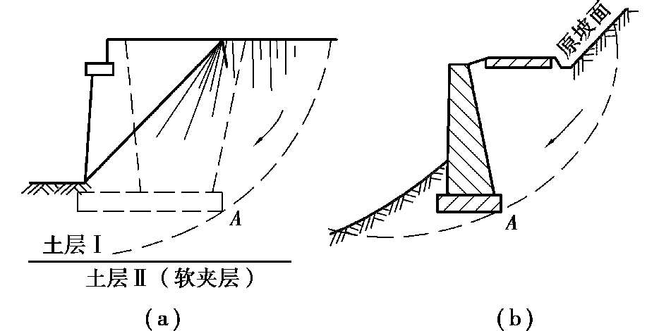 位于软土地基上较高的桥台需验算桥台沿滑裂曲面滑动的稳定性。基底下地基如在不深处有软弱夹层时,在台后土推力作用下,基础也有可能沿软弱夹层Ⅱ的层面滑动,如图 2.15(a)所示;在较陡的土质斜坡上的桥台、挡土墙也有滑动的可能,如图 2.15(b)所示。