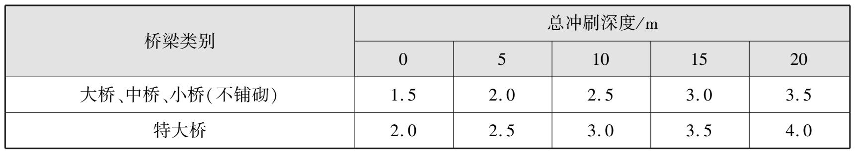②表列数值为墩台基底埋入总冲刷深度以下的最小值;若对设计流量、水位和原始断面资料无把握或不能获得河床演变准确资料时,其值宜适当加大。