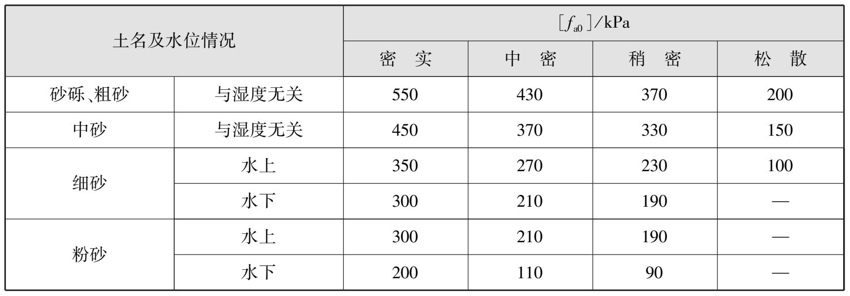 表 2.6 砂土地基容许承载力[ f a0 ]([ σ 0 ])