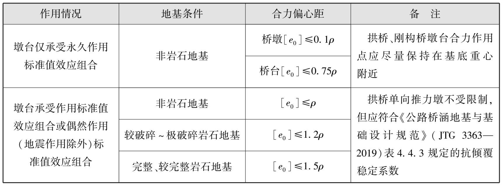[ e 0 ]——基础合力偏心距允许值,与荷载情况和地质条件有关,公路桥涵墩台基础合力偏心距控制要求如表 2.13 所示。