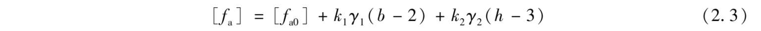 修正后的地基承载力容许值[ f a ]按式(2.3)确定。基础位于水中不透水地层上时,[ f a ]按平均常水位至一般冲刷线的水深每米再增大 10 kPa。