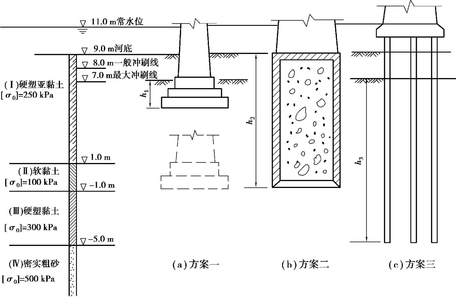 【解】根据已知水文地质资料,由于基础修建在长年有流水的河中,所以可以不考虑冻结深度的影响,而主要根据最大冲刷深度确定基础的埋置深度。土层Ⅰ、Ⅲ、Ⅳ均可作为持力层,具体可选择如下 3 种方案: