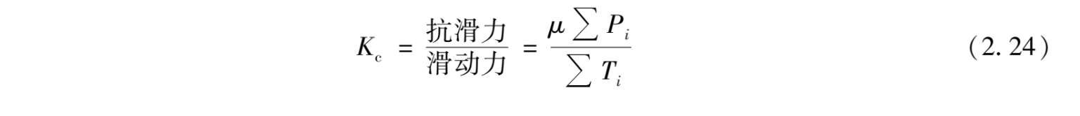 基础在水平推力作用下沿基础底面滑动的可能性即基础抗滑动安全度的大小,可用基底与土之间的摩擦阻力和水平推力的比值K c 表示,K c 称为抗滑动稳定系数,可按下式计算: