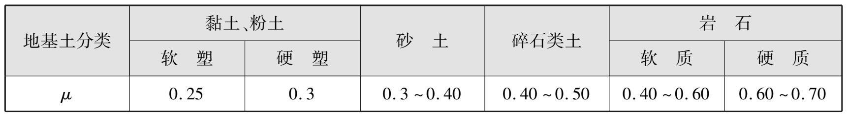 式中,抗滑力计算涉及的基础底面(圬工材料)与地基土之间的摩擦系数μ,在无实测资料时,可参照表 2.14 选用。