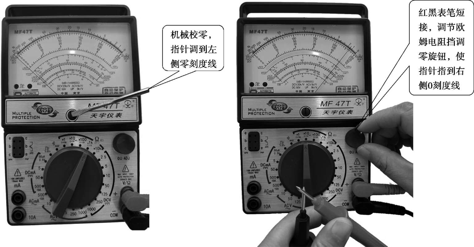 ②调零:指针式万用表使用前首先要机械校零。在测量电阻时,更换量程后也需要调零。方法是红、黑表笔短路,调节欧姆电阻挡调零旋钮,使指针指到右侧0刻度线,如图1-33所示。